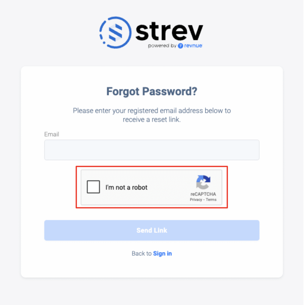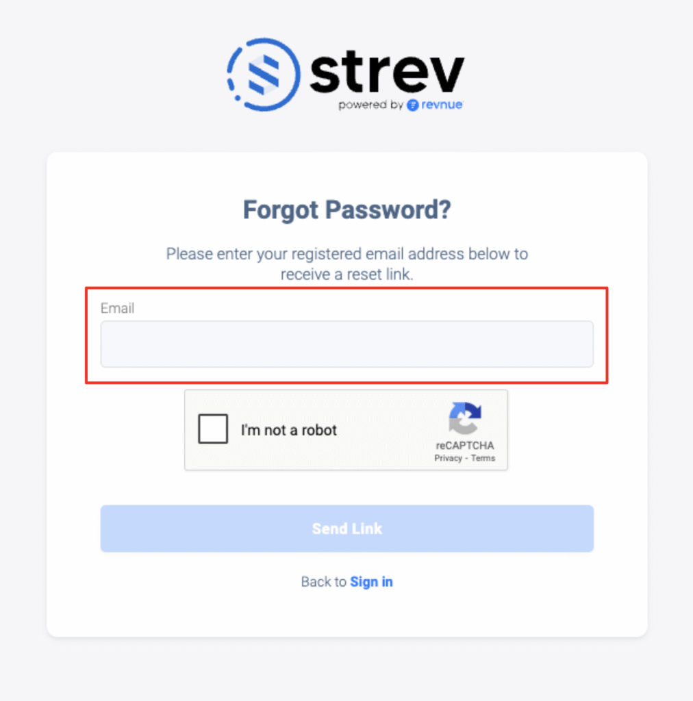 2. You will be routed to the “Forgot Password?” page. Enter the email address for your Strev account.
