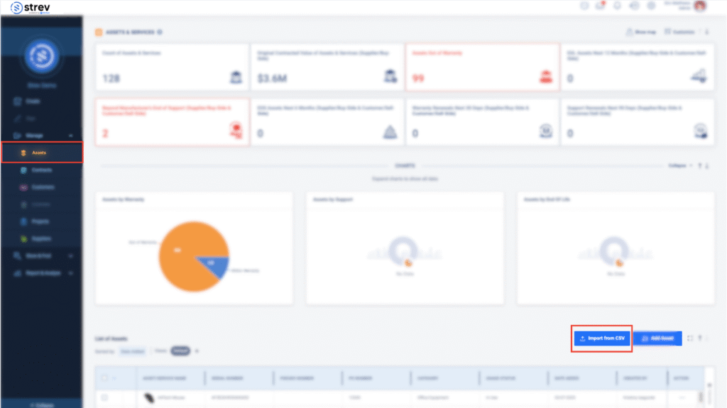 - Click the Import from CSV button on the bottom-right of the asset table.